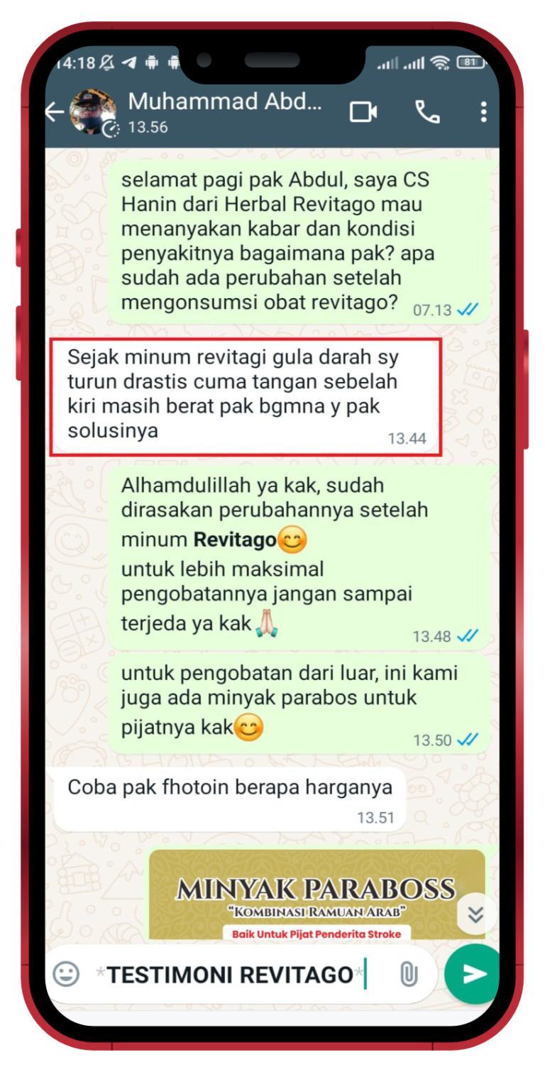 Testimoni Pasien: Banyak pasien yang telah merasakan manfaat dari terapi di Rumah Sehat Paraboss. Salah satunya adalah Pak Mustarja, yang setelah dua tahun mengalami stroke, berhasil pulih berkat terapi minyak herbal Paraboss dan konsumsi Revitago. Kisah sukses seperti ini menjadi inspirasi bagi kami untuk terus memberikan yang terbaik bagi setiap pasien.